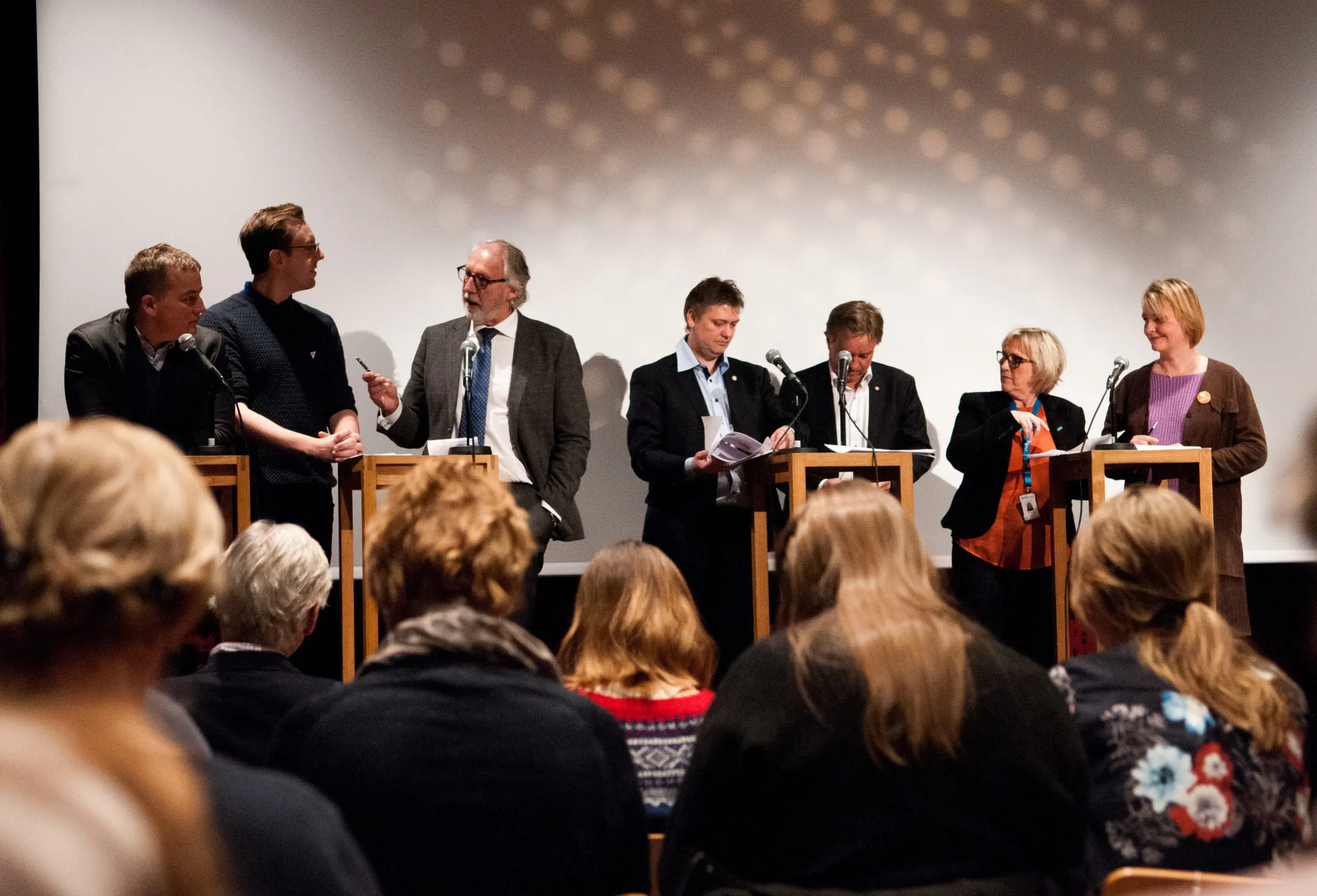 Tore Hagebakken, AP, Nicholas Wilkinson SV, Carl-Erik Grimstad V, Sveinung Stensland H , Jan Steinar Engeli Johansen FrP og Lene Haug, Helsepartiet kommer samt leder for Delta Helsefagarbeiderne Jette Dyrnes.