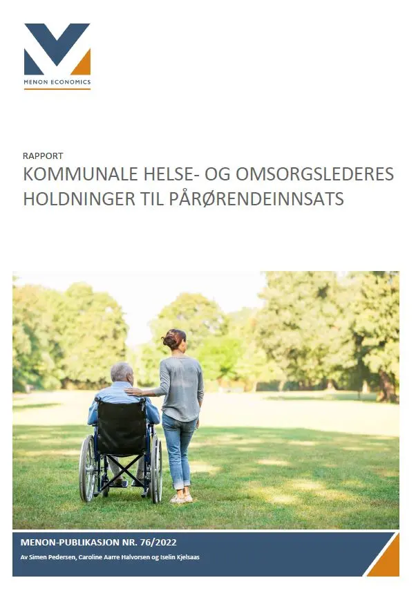 På oppdrag fra Pårørendealliansen har Menon Economics utarbeidet følgende rapport basert på spørreundersøeklse til alle norske kommuner: - Vår spørreundersøkelse til helse- og omsorgsledere i norske kommuner forteller oss at den kommunale helse- og omsorgstjenesten i varierende grad er kjent med pårørende¬veilederen og pårørendestrategien. Over en femtedel av de kommunale helse- og omsorgs¬tjenestene har heller ikke egne skriftlige retningslinjer og rutiner på plass for involvering av pårørende. Et flertall av helse- og omsorgslederne som har svart vurderer at de samarbeider godt med pårørende, samtidig som de anerkjenner at man burde samarbeide bedre og mer. Pårørendesamtaler, involvering av pårørende i brukerutvalg og pårørendegrupper nevnes som tiltak for å bedre samarbeidet. Kildehenvisning: Forfattere. Rapport nr xx/yy utarbeidet av Menon Economics. Rapport bestilt av Pårørendealliansen