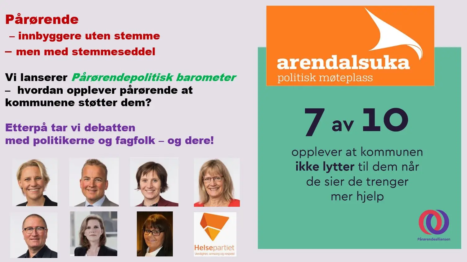 Det er Kommunsvalg i år og derfor lanserer vi Pårørendepolitiskbarometer – om hvordan pårørende opplever støtten fra kommunen sin. Etterpåblir det debatt med følgende politikere:Sveinung StenslandKjerstiToppeGeir Jørgen BekkevoldKarin AndersenIngrid WilliamsenMaria Karine Aasen-SvensrudAnne Kristin VieHelsepartiet ordførerkandidat Oslo, Arendal eller Lillestrøm