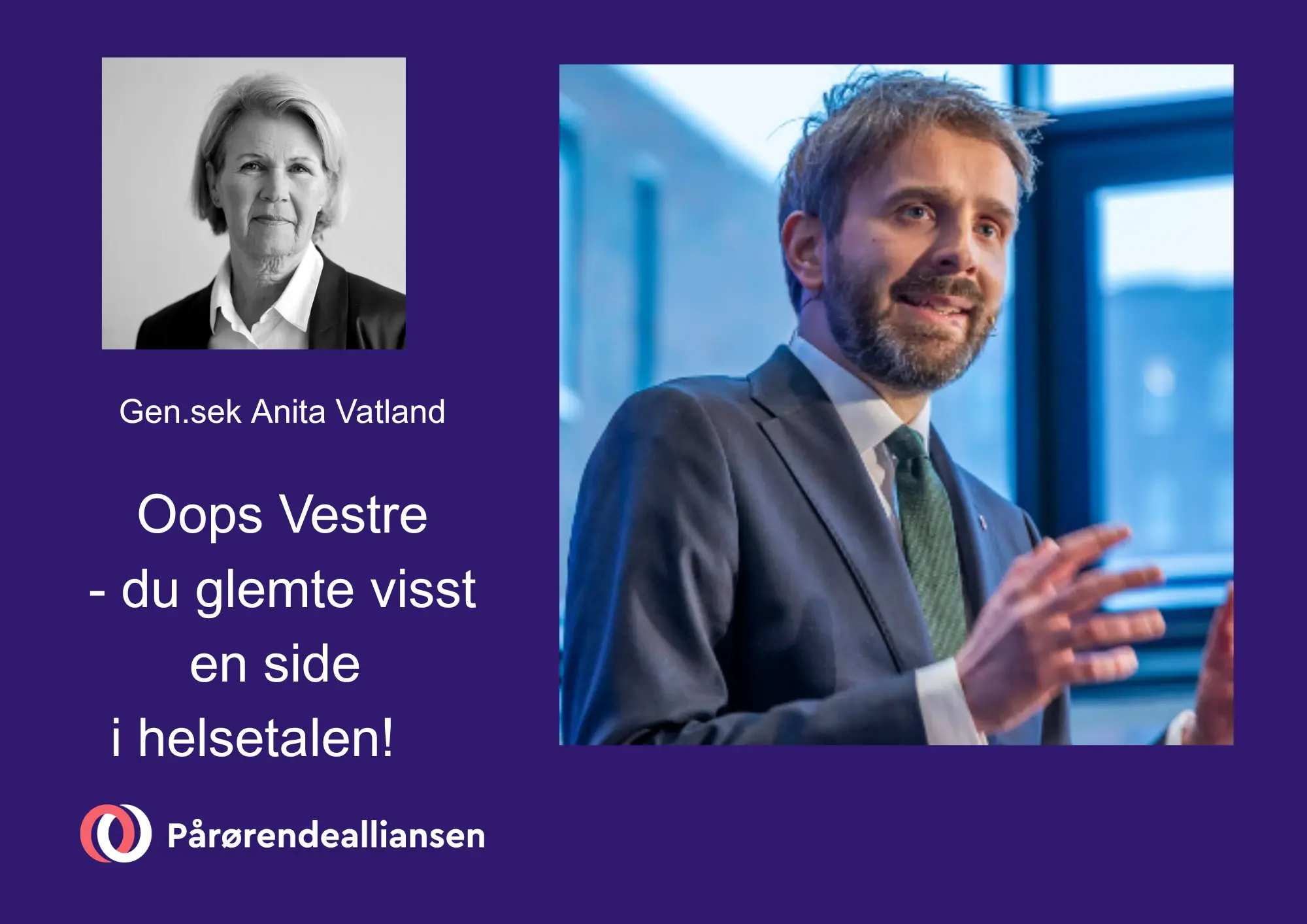 «Nå har vi snakket om medarbeiderne i helsetjenestene, og vi har snakket pasientene. Den siste gruppen vi må si noe om er pårørende – for de er jo også en del av laget. Faktisk halvparten av laget, som aldri får vaktplan, hvor mange ikke har pauser, HMS eller verneombud – og likevel møter de opp - hver dag.