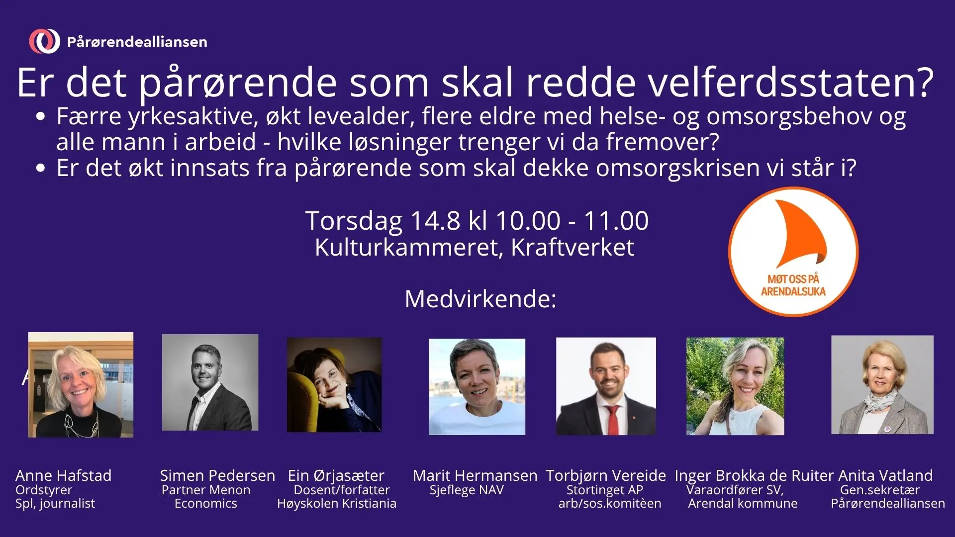 Basert på vår rapport lansert tidligere i vår tar vi debatten om helsepolitikken og arbeidslinja er forenelig fremover, når pårørende både skal gjøre mer samt stå i jobb? I så fall - hvilke løsninger trenger vi for å få det til?